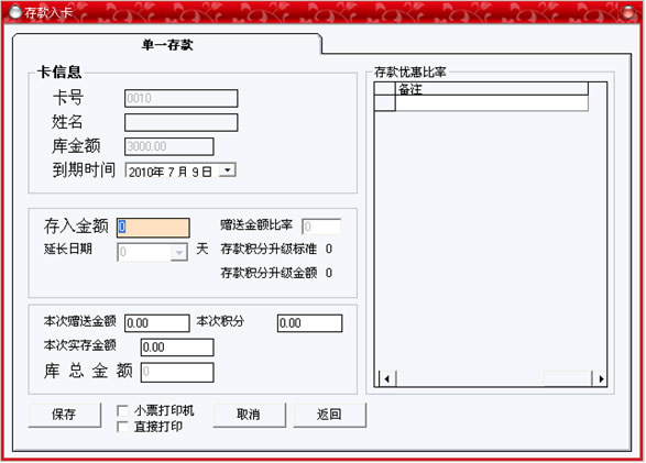 此菜單主要是為了給儲值卡用戶消費(fèi)一段時間后,充值用的,發(fā)行新卡時類型為儲值卡,當(dāng)時沒有填入“庫金額”時,也可在此窗口來加入金額。