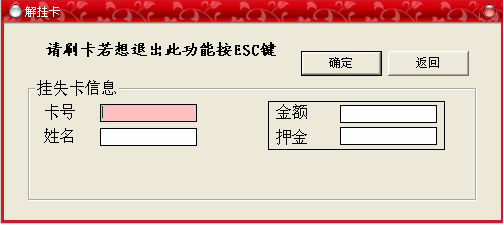 此菜單上面已經(jīng)提到,主要功能是對已經(jīng)掛失的卡進(jìn)行解掛,恢復(fù)正常使用。