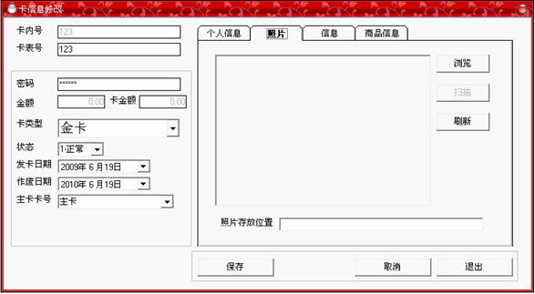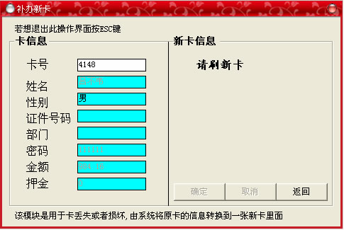 此窗口的功能主要是:當(dāng)發(fā)行的卡的一些信息輸入錯誤時,可以通過輸入卡號,調(diào)出關(guān)于此卡的所有信息,進(jìn)行修改,有時發(fā)行卡時未及時輸入個人信息時,也可以通過此窗口來補(bǔ)錄。輸入卡號后直接回車即可,然后當(dāng)修改完畢時,點(diǎn)擊保存后退出。
