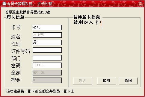 此菜單的主要功能是:將一張卡的金額合并到另外一張卡上,在進(jìn)行并卡處理之前一定要先將要并卡處理的卡進(jìn)行掛失操作,然后在出現(xiàn)的窗口中輸入要合并的卡號回車,提示輸入轉(zhuǎn)到的卡號然后回車,會出現(xiàn)如下的提示,點(diǎn)“確定”按鈕則合并成功,點(diǎn)“取消”按鈕,則取消本次操作,操作完畢點(diǎn)“返回”退出。