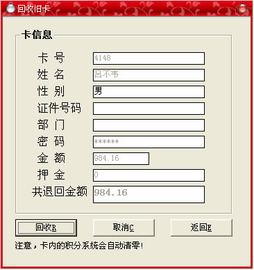 出現(xiàn)如上窗口后,輸入要收回的卡號,直接回車,會顯示所有資料,然后點(diǎn)“回收”按鈕,出現(xiàn)一提示提示是否要回收,點(diǎn)“確定”按鈕回收成功,操作完畢后點(diǎn)“返回”按鈕退出。