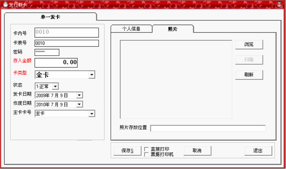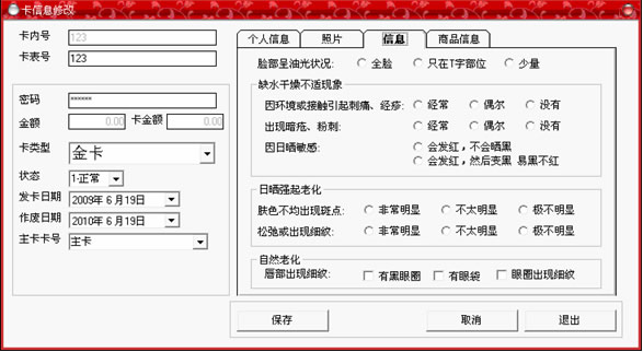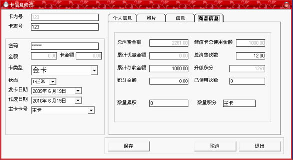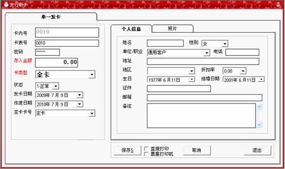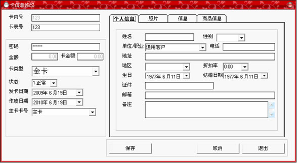 黑色,即可以輸入卡中所存入的金額,如果類型為會員卡,那么將顯示為灰色;在右邊的個人信息選擇中,可以詳細(xì)記錄持卡人的各種資料,全部填寫完畢后,點(diǎn)“保存”按鈕。