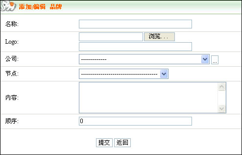 點(diǎn)“創(chuàng)建”,就可以創(chuàng)建一個(gè)新品牌。注意:創(chuàng)建一個(gè)新品牌的前提是--前臺(tái)必須建立了該品牌的節(jié)點(diǎn),否則品牌無法創(chuàng)建。用戶要輸入品牌名稱、品牌LOGO,從公司的下拉列表中選擇該品牌所屬的公司,從節(jié)點(diǎn)中選擇該品牌前臺(tái)展示頁面所對(duì)應(yīng)的節(jié)點(diǎn),輸入品牌的介紹,輸入數(shù)字表示該品牌在品牌列表中的排序。點(diǎn)“提交”,即完成該品牌的創(chuàng)建。