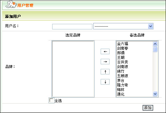 點(diǎn)“品牌管理”界面下方的“設(shè)置權(quán)限”,可以設(shè)定某個(gè)管理員管理品牌的范圍。從下拉菜單中選擇一個(gè)管理員,從備選品牌中選定該管理員可以管理的品牌,支持多選和全選。最后點(diǎn)添加,即可完成品牌管理權(quán)限的設(shè)置。