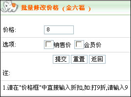 “批修”是指對(duì)該商品做批量的價(jià)格修改,價(jià)格框中填寫折扣數(shù)字??梢赃x擇是對(duì)哪種價(jià)格進(jìn)行修改,如銷售價(jià)、會(huì)員價(jià)。