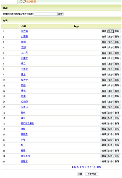 點(diǎn)“品牌管理”,進(jìn)入以下界面。所有品牌統(tǒng)一在一個(gè)列表中出現(xiàn)。用戶可以從上面的“查詢”中輸入所要查詢的品牌,點(diǎn)搜索即可查出該品牌。